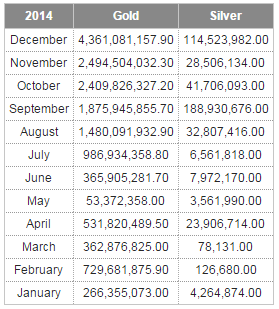 The market’s total trading volume for 2014 was RUB 16.4 bln, or 9.4 tons of gold and 18.9 tons of silver.