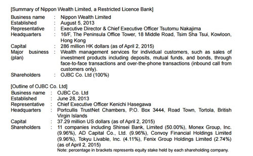 Shinsei Bank and Monex Group were the founding investors of OJBC established in June 2013, and since December 2013, other Japanese companies including AD Capital and Tokyu Livable, as well as leading local companies in Hong Kong such as Convoy, the largest IFA (Independent Financial Advisor) in Hong Kong, and Fenix Group Holdings Limited (Chairman Masaaki Ogino; CEO Anthony Keung), which holds the largest high-end super market chain, City Super, within its group, have invested in OJBC. OJBC’s capital as of April 2015 was 37.29 million US dollars, of which Shinsei Bank owns 50% of the voting rights.