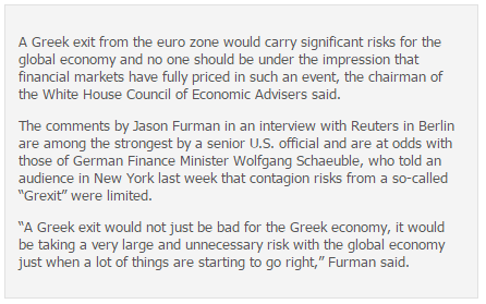 There is a very good chance that a Grexit would set off a full-blown European financial panic. And once a financial panic starts, it is very hard to stop. The danger that a Grexit poses is so obvious that even the Obama administration can see it…