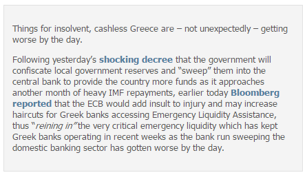 Meanwhile things continue to get even worse inside Greece. If you have any money in Greek banks, you need to move it immediately. The following comes from Zero Hedge…