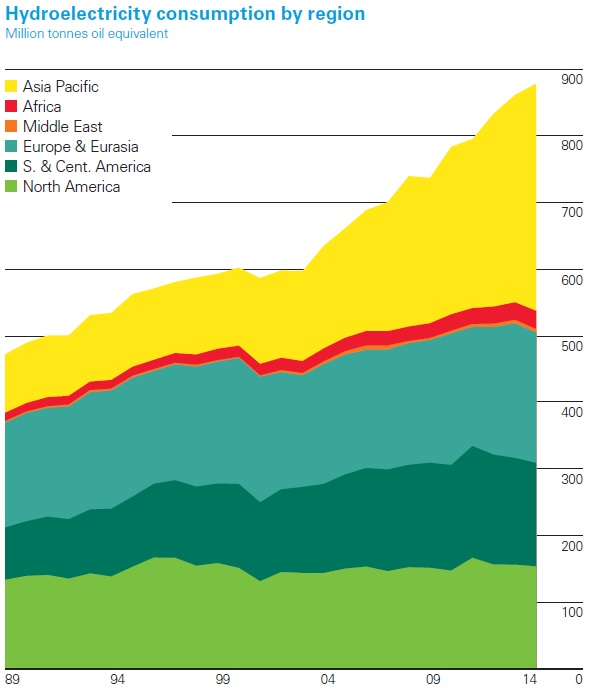 Hydroelectric power is also on the rise, especially in the Asia-Pacific region. It is notable how little hydro power there is in Africa, a region that desperately needs more and more reliable electrical power.
