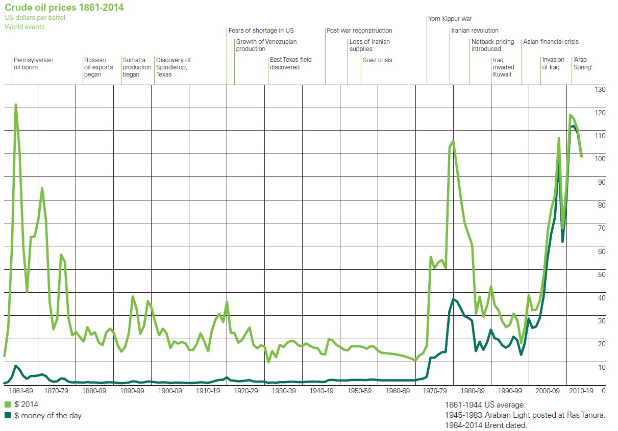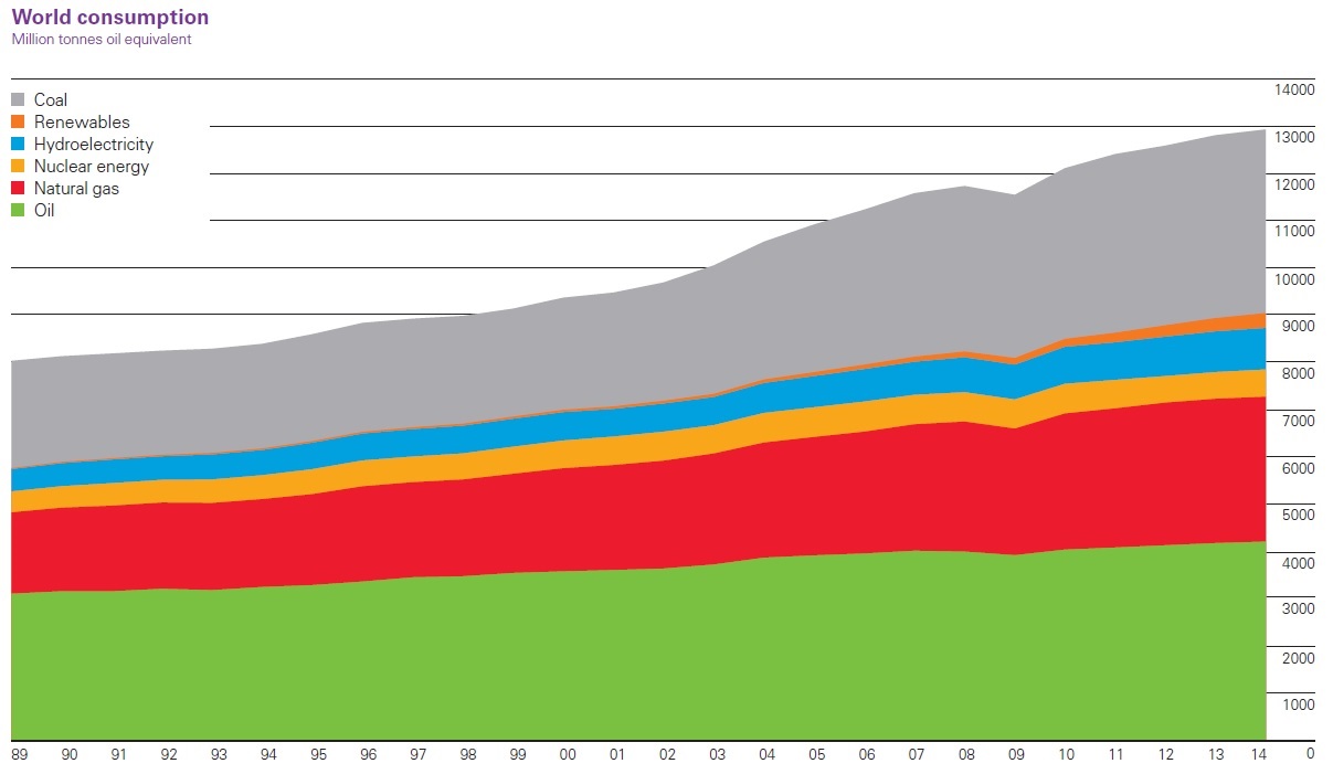A more detailed breakdown of these sources of energy offers some additional insights. As Bob Dudley notes in his introduction to the report: “The US replaced Saudi Arabia as the world’s largest oil producer – a prospect unthinkable a decade ago. The growth in US shale gas in recent years has been just as startling, with the US overtaking Russia as the world’s largest producer of oil and gas.” For oil, the big recent shift is the fall in prices, due both to this rising supply and because “[g]lobal primary energy consumption increased by just 0.9% in 2014, its slowest rate of growth since the late 1990s, other than immediately after the financial crisis.”