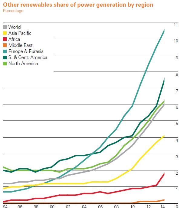 While non-hydro remain small slice of total global energy production, if one focuses just on their role in producing electricity, their share is somewhat higher–now above 10% in the Europe and Eurasia region. Within the EU region alone, the report notes that non-hydro renewables now provide 17% of electrical power (although this has been achieved through hefty public subsidies that are now under reconsideration in a number of countries).