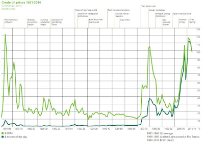 Here’s the long-term pattern of oil prices, with the inflation-adjusted price in light green. The current price is now under $60/barrel, so you need to imagine that what looks like a relatively small drop in oil prices on the right-hand side of the figure just keeps falling.
