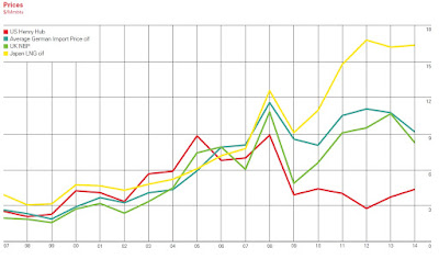 For natural gas prices, the interesting fact is that unlike oil, there isn’t a single global price. It’s much more costly to ship natural gas all over the world, and so the surge of natural gas supply in the US has kept US natural gas prices lower than prices elsewhere in the world, giving US producers who consume energy a competitive advantage. The US price for natural gas is shown by the red line.