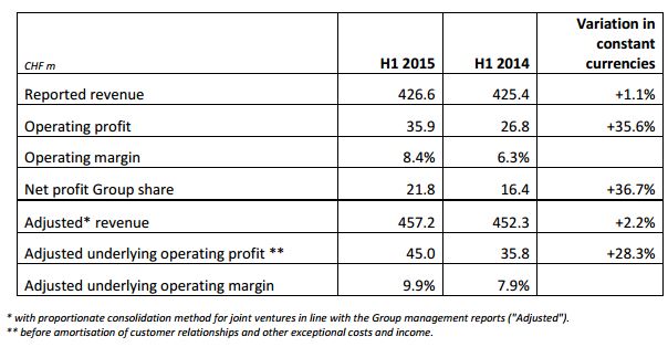 Reported operating profit increased by 35.6% in constant currencies to CHF 35.9m for a margin of 8.4% compared with CHF 26.8m and a margin of 6.3% respectively in the first half of 2014.