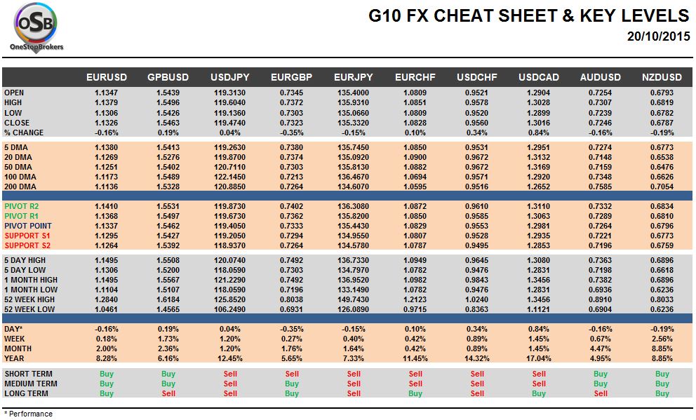 G10 FX Cheat Sheet & Key Levels 20-10-2015