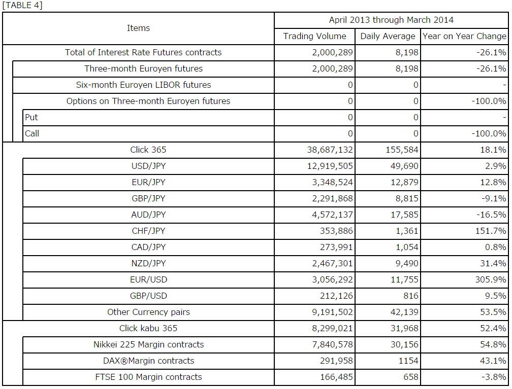 In addition,The total trading volume of Exchange Equity Index Margin contracts (Click kabu 365) was 8,299,021 ( + 52.4% YoY) and its average daily trading volume was 31,968 .