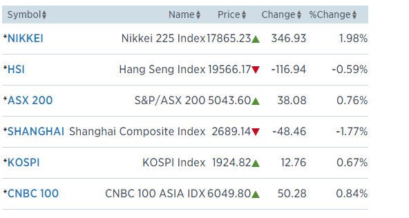 In Japan, the Nikkei 225 was up 1.89 percent while the Topix gained 1.93 percent in morning trade. Across the Korean Strait, the Kospi was up 0.18 percent.