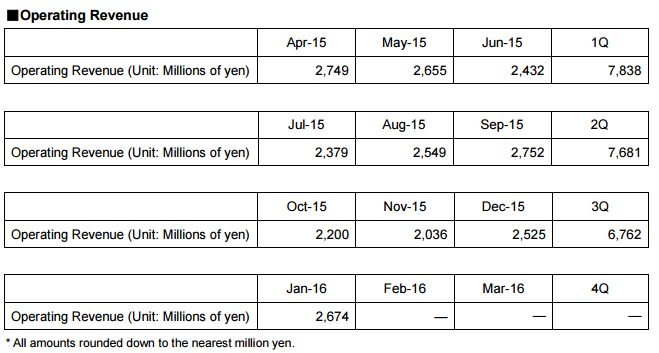 GMO CLICK published January 2016 Monthly Report of Operating Revenue