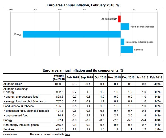 Euro area annual inflation is expected to be -0.2% in February 2016, down from 0.3% in January, according to a flash estimate from Eurostat, the statistical office of the European Union.