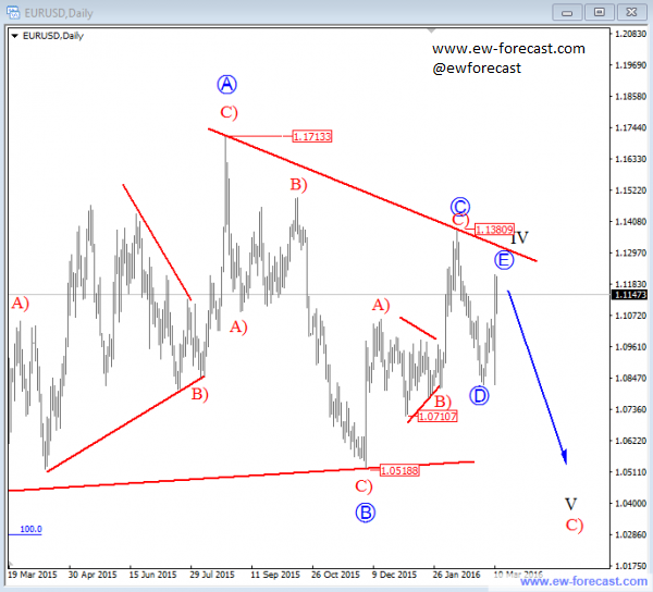 Gregor - Author BIO photoEURUSD price bounced this month but despite some strong bullish momentum we need to keep an eye on the big picture which still shows a sideways price action since start of 2015. We are tracking a triangle which has one of the most complex structures; but important is that it’s a continuation pattern so we shall see more weakness after a completion of A-B-C-D-E subwaves. At the moment we see price in wave E that can find resistance around 1.1200-1.1300 area. We however need an impulsive reversal down next week to confirm more weakness ahead; into big wave V that will go beneath 2015 lows. A short-term invalidation level is at 1.1380; rise above it will put wave C-circled back in play.