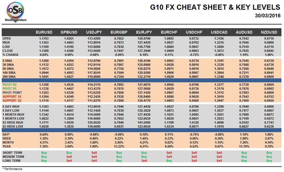 Wednesday, March 30: OSB G10 Currency Pairs Cheat Sheet & Key Levels