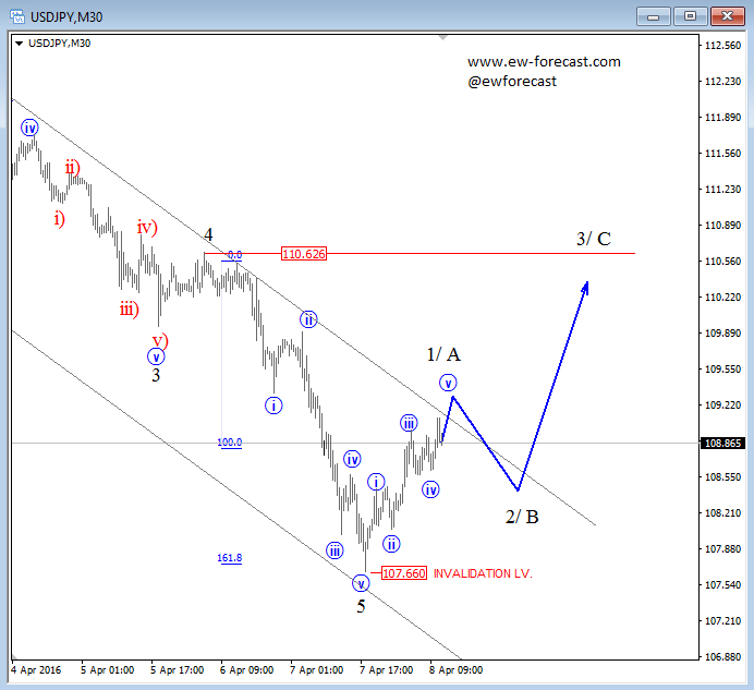 Stocks were trading sharply to the downside yesterday which caused some strong buying of Japanese yen, but this can be changing now based on latest price action on USDJPY. We have seen quite a strong turn up so far from 107.66 low, clearly in five waves which suggests that low can be in place and that a minimum of three waves up may be unfolding, ideally towards 110 region, where previous wave 4 can react as a resistance into lower levels, but only after the completion of wave 2/B, that can find support near 108-30-108.55 area.