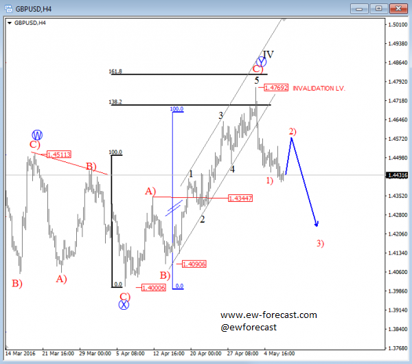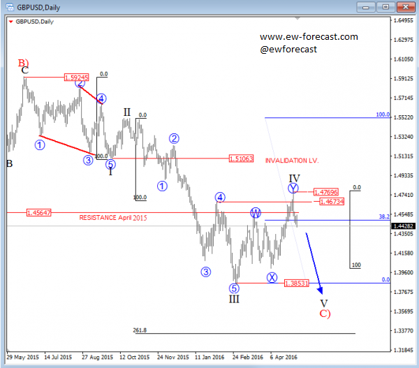 On the lower time frame, GBPUSD has turned sharply lower last week from 1.4769 where we saw signs of a top in place. Reason is a strong, impulsive decline and broken channel line connected from 1.4090 that puts bearish trend in play. So ideally market accomplished a big corrective wave IV that was underway since end of February. This however is still an early call, but we will definitely look for three waves down, down to 1.3433.