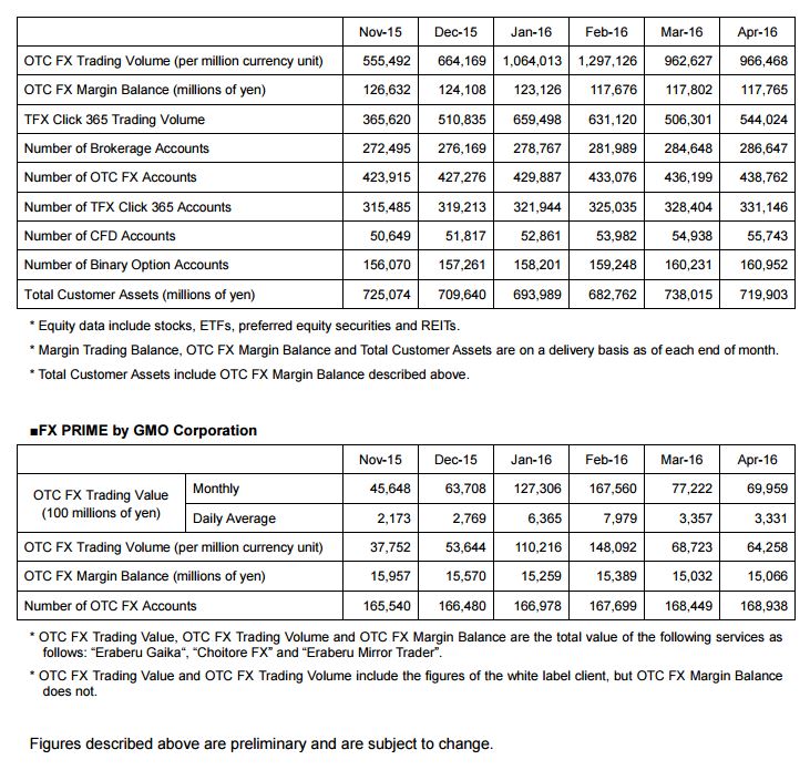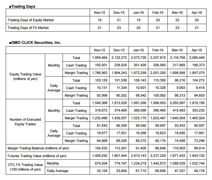 GMO CLICK Holdings, Inc. today released the following monthly preliminary report of its subsidiaries for April 2016.