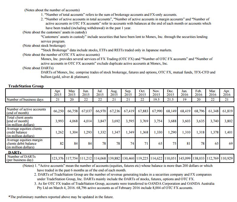 Monex Group, Inc. (TSE 8698, Oki Matsumoto, Representative Executive Officer and CEO) today reported the following monthly business metrics of its subsidiaries in April 2016.