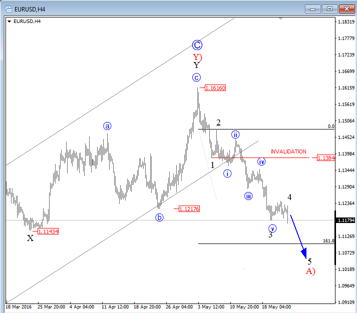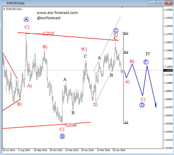 On the lower time frames, EURUSD is trading nicely lower for the last few weeks and it has now shape of an impulsive decline underway if we consider sharp fall last week to 1.1200 area which was our minimum downside objective. But decline looks strong from the last few weeks, so maybe it was black wave 3 and that is why we will expect more downside after current corrective bounce in wave 4 is finished. We believe a drop down to 1.1000 area could be possible as part of wave A of D within a triangle.
