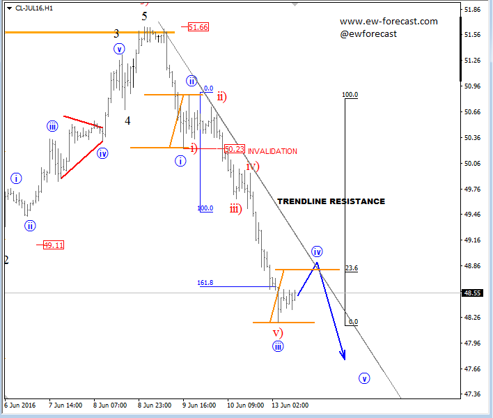 We have searched for a top on the US oil futures and it seems we got it in the last few days of trading at 51.66 levels. From there price fell in almost a completed five wave drop. Current labeling suggest this impulse is still not over and that we have one more push down to complete this five wave pattern. Pullback which is now unfolding is blue wave iv which could find its resistance at 48.80-90 zone, before price turns lower to complete blue wave v around the support at 47.30-50 region. From there we would expect a reversal in an ABC corrective manner.
