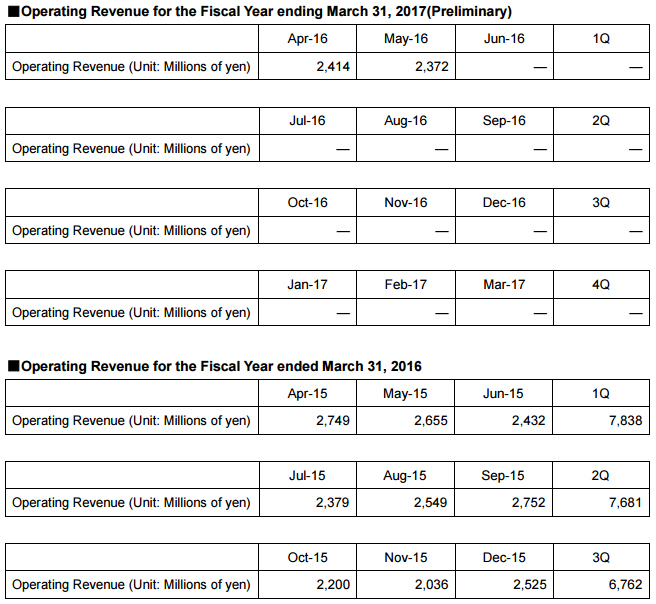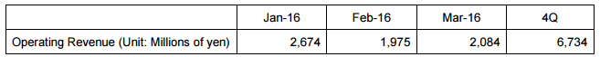 GMO CLICK published April 2016 Monthly Report of Operating Revenue