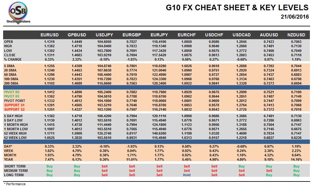 Tuesday, June 21: OSB G10 Currency Pairs Cheat Sheet & Key Levels