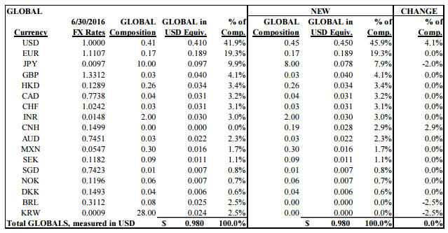 The new composition contains 15 currencies, one fewer than the prior composition. The Company currently transacts business and is required to manage balances in each of these 15 currencies. The new composition is effective as of the close of business on June 30, 2016 and the conversion to the new targeted currency holdings is taking place over a short time period.