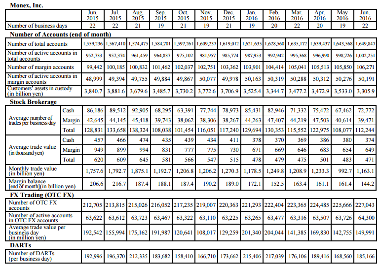 Monex Group Inc. issued an announcement of Monthly Disclosure for June 2016