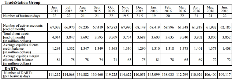 3. As for OTC FX trades of TradeStation Group, accounts were transferred to OANDA Corporation and OANDA Australia Pty Ltd on March 4, 2016. 68,796 active accounts as of February 2016 include 8,004 of OTC FX accounts.