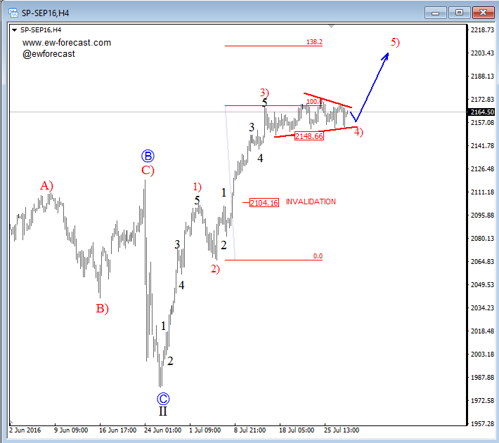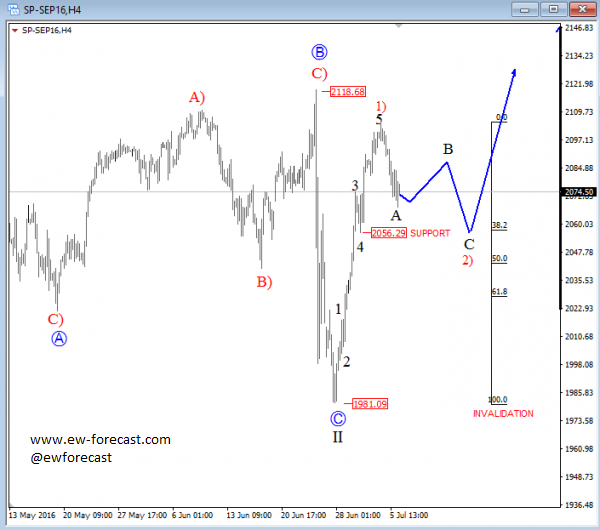 On the lower time frames, S&P500 fell sharply into wave C following UK votes two weeks back; it moved down into final wave of a big corrective set-back from April of this year. We see a flat correction, that is a 3-3-5 contra-trend move that appears finished following recent bounce from 1981 that has impulsive qualities so we think that price may go much higher but after a pullback down into a red wave 2) that is now underway to around 2040-2055.