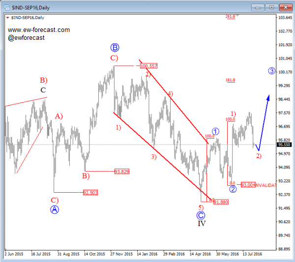 On USD index daily chart we are observing a big sideways pattern since start of 2015; it’s slow, sideways and overlapping price action which is a personality of a contra-trend movement that can be completed now. We see it as a flat correction in black wave IV; a three wave structure where final wave C should be made by five waves. Well, we have seen a nice decline from November of 2015 counted in five legs, but as an ending diagonal. That’s a reversal pattern that already caused a strong bounce in May, so ideally recent sharp leg down was just a pullback labeled as wave two within ongoing uptrend and recent sharp turn to the upside is undergoing wave 3, which could ideally reach 99 region.