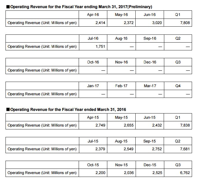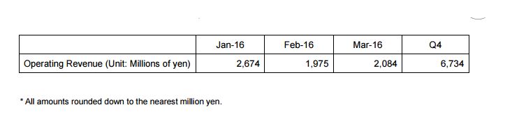 GMO CLICK published April 2016 Monthly Report of Operating Revenue