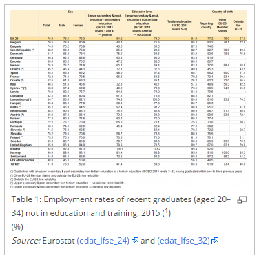 The employment rates at EU-level for graduates having left education or training during the last three years shows that for those with a tertiary education it was 79.9 % in 2015, while the corresponding rate for vocational graduates was 6.9 percentage points lower. By contrast, the employment rate for generalist graduates was considerably lower, at 60.5 %, or some 19.4 percentage points below the corresponding figure for tertiary graduates.