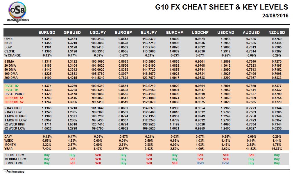 Wednesday, August 24: OSB G10 Currency Pairs Cheat Sheet & Key Levels