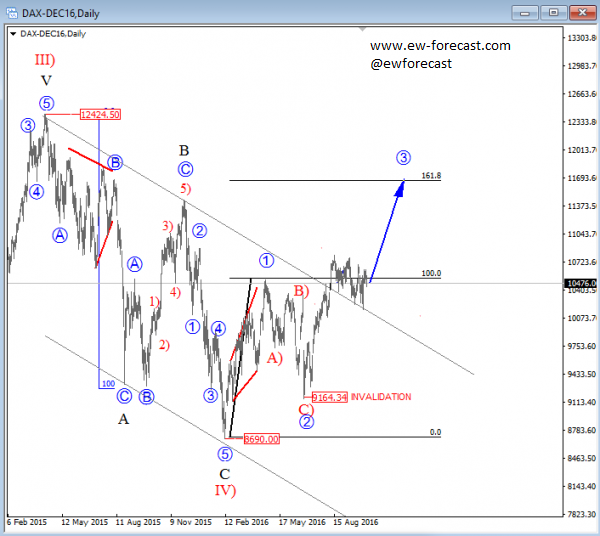 Regarding the lower time frames.. Two weeks back German DAX turned up strongly from 10173, clearly with an impulsive price action so we see it as wave 1 that is part of a bigger bullish cycle. As such we think that strong uptrend will continue soon, as we see current retracement down slow and overlapping; probably wave two within uptrend that can look for a base at 38.2-61.8% Fib. level.