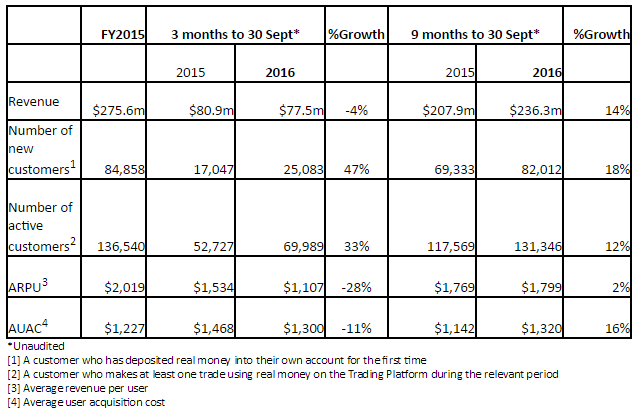 Plus500, an online service provider for retail customers to trade CFDs internationally, has published a trading update for the three and nine months ended 30 September 2016.