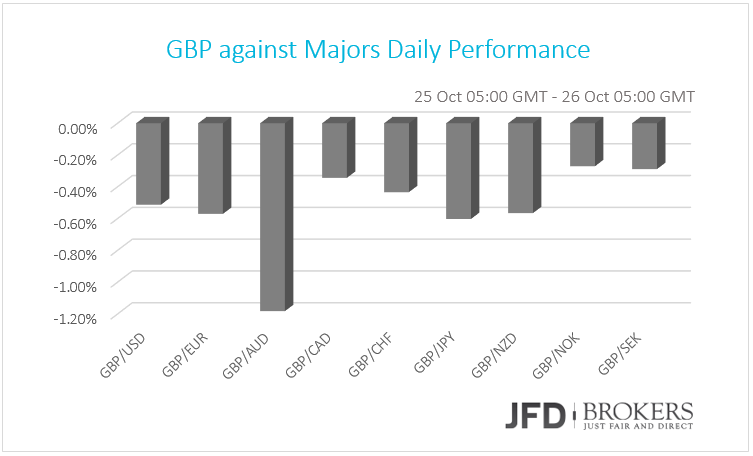 Tomorrow, the flash U.K. GDP growth data for Q3 will be released. No change is expected at the year-over-year growth, which is 2.1% since the last quarter, but on a quarterly basis the growth is predicted to slow down to 0.4% from the previous 0.7%. Next Thursday, traders will closely follow the Bank of England policy meeting and will also keep a tab on the Quarterly Inflation report, scheduled to be published together.