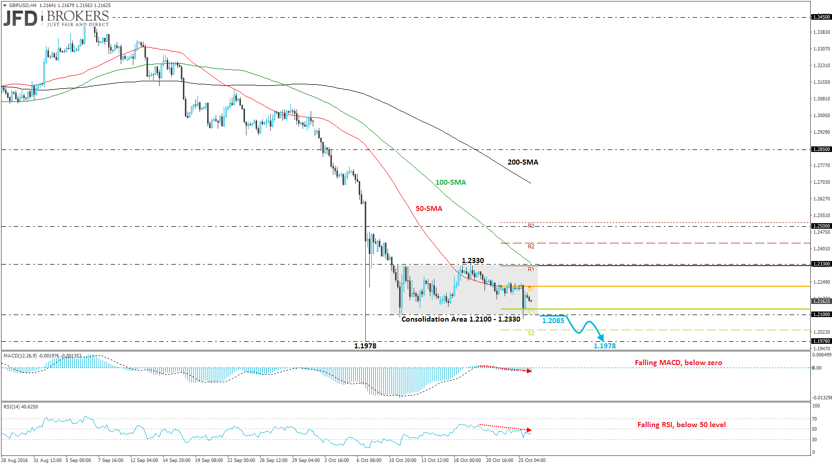 The GBP/USD pair plunged to a fresh 2-week low and retested the 1.2100 significant psychological support level. The pair fell more than 1%, over the last six sessions, following the strong rebound on the 1.2330 resistance level which overlaps the 100-SMA on the 4-hour chart and the first resistance level of the pivot points. Also, the pair is recording the sixth negative month in a row and the only economic report worth watching these days will be both the U.K. and U.S. GDP growths tomorrow and on Friday, respectively.
