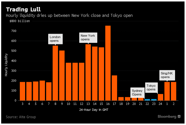 Between the New York close and the start of trading in Tokyo, foreign-exchange volumes dwindle to just 2 per cent of peak turnover, according to Aite Group, a consultant in Boston. As a result, any transaction in that two-hour window will hit the market disproportionately hard.