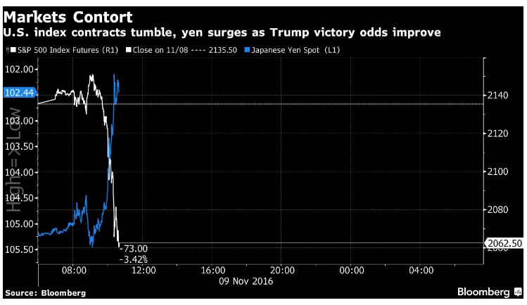 Panicked investors rushed to unwind bets they’d piled on amid predictions Clinton would sweep to victory, fueling demand for haven assets. Futures on the S&P 500 Index plunged by a 5 percent limit that triggers trading curbs and Asian shares sank by the most since the aftermath of Britain’s shock vote to leave the European Union. Mexico’s peso had its steepest plunge since 2008 on concern a Trump win would lead to more protectionist U.S. trade policies. Gold jumped by the most since 2009, surging with the yen and U.S. Treasuries.