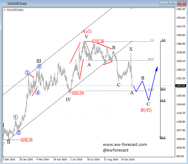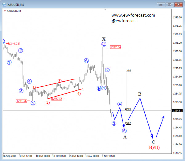 On the lower time frame, we see Gold moving sharply lower, away from 1337 swing high where market might have found a temporary top if we consider a very strong sell-off which looks like an impulse. As such, we updated the wave count, labeled it as wave X high at 1337 that belongs to a combination of two zigzags in wave B)/II) that can be underway down to 1150/70 area. In the meantime, be aware of a bounce up in wave B, but after completion of wave A near 1200 mark.