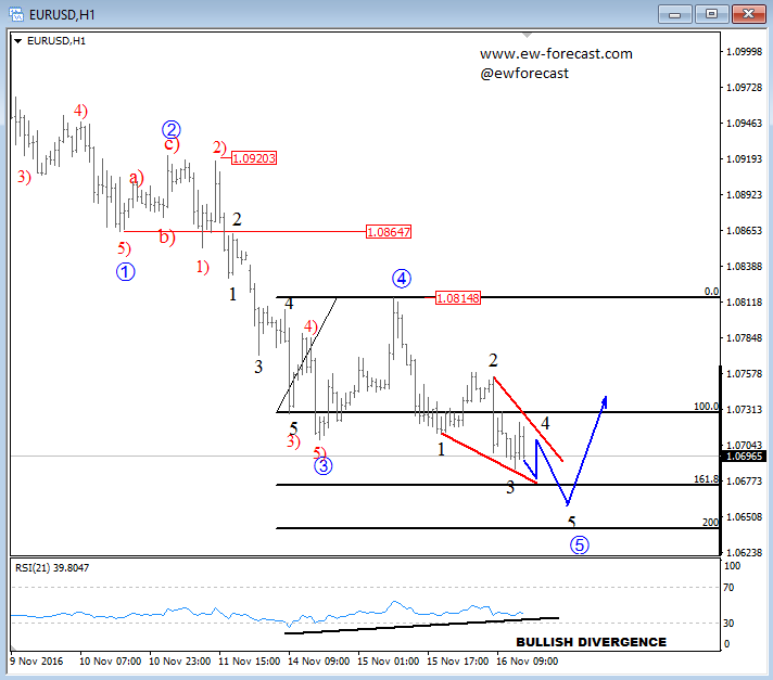 EURUSD keeps trading lower within a higher degree impulsive wave, now specifically in black sub-wave 4, that can be part of an ending diagonal, that usually shows up in the fifth and final wave. If we are right, then this unfolding ending diagonal can after its completion act as a nice reversal higher and ideally push price higher towards the former wave 4 located at the 1.0814 level. This probable reversal may take place around the 161.8 or 200 Fibonacci ratio. And another indication that suggests a probable reversal taking place is the bearish RSI divergence.