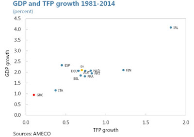 Greece joined the European Union in 1981. The The horizontal axis shows growth of “total factor productivity,” or TFP, for countries of Europe from 1981 to 2014. Greece lags well behind the other countries with an annual productivity growth rate of 0.1%. The vertical axis shows growth in real GDP over time. Again, Greece lags behind with an average annual growth rate of 0.9%. Again, these are not numbers just for the last year or two, but instead are averages during a period of 33 years.