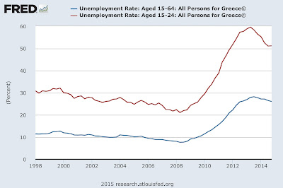 That collapse in the size of Greece’s economy brought sky-high unemployment with it. The lower blue line shows the unemployment rate for those aged 15-64: it rises from under 10% (already a disturbingly high level) around 2008 to more than 25%. The red line shows the unemployment rate for those 15-24. One expects the unemployment rate for this group to be higher than average: still, having it spike to almost 60% is a sign of an economy in extraordinary disarray.
