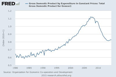 Here’s a perspective on the size of the GDP in Greece, generated by the ever-helpful FRED website run by the Federal Reserve Bank of St. Louis. In the figure, GDP for 2010 is set equal to 100. Thus, from 1981 up through the early 2000s, you can see a gradual rise in growth that seems to be taking off after about 2000–of course, fed at that time by the huge accumulation of government borrowing and spending. You can also see the Depression-sized drop in output, with the economy falling by roughly one-third in size in the last 6-7 years.