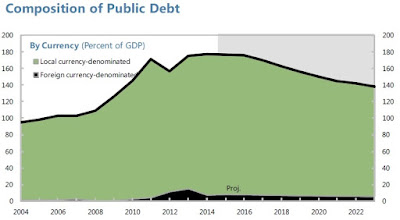 Here’s a figure from the IMF showing the rise in Greek public debt in the last decade. The near-doubling in debt/GDP ratio from 2004 to 2011 is remarkable, and since then the problem has been one of damage containment. (The projections for the future assume that various reforms are undertaken, so they should only be swallowed with a skeptical tablespoon of salt.) As you can see, essentially all of the debt is in euros.